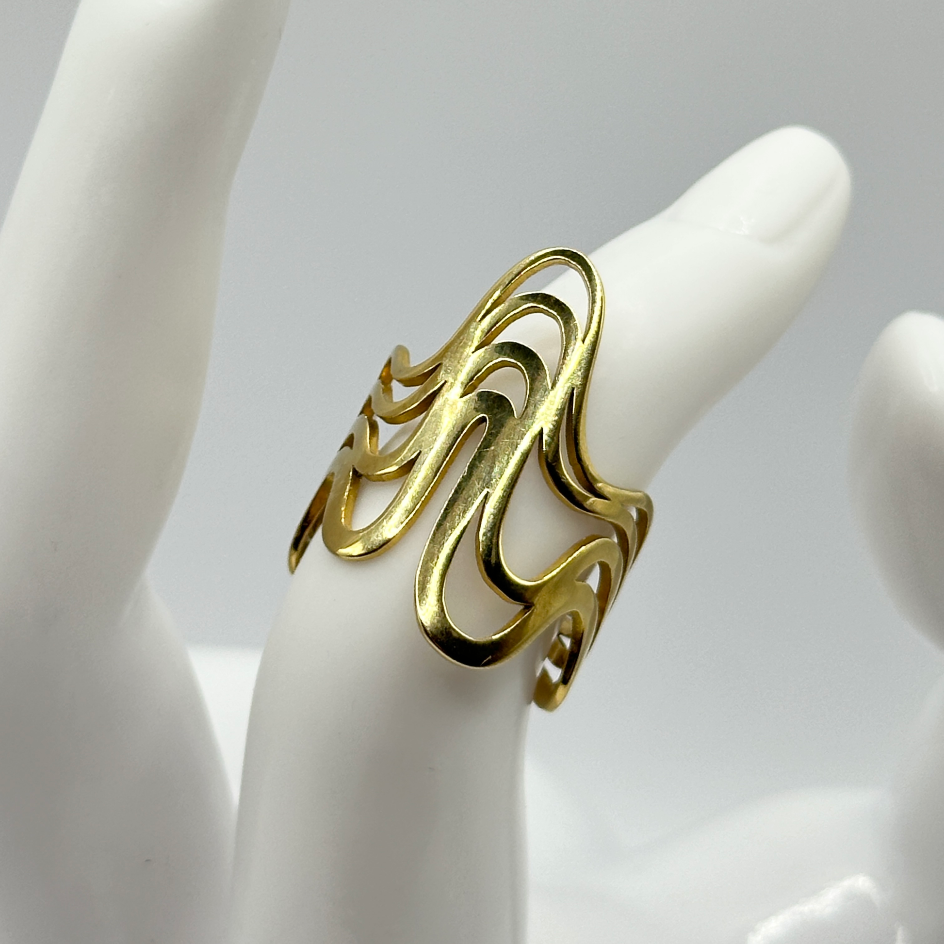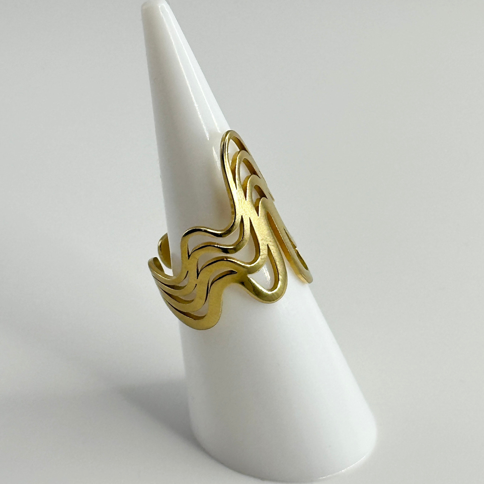 Anillo Ondina: elegancia fluida en cada gesto. Ajustable en acero inoxidable dorado captura la belleza del movimiento del agua con cuatro filas de ondas de diferentes tamaños que crean un efecto visual dinámico y sofisticado. Perfecto para quien busca una joya versátil que combine estilo moderno con un toque natural. Resistente y duradero. Una pieza que refleja tu personalidad única.