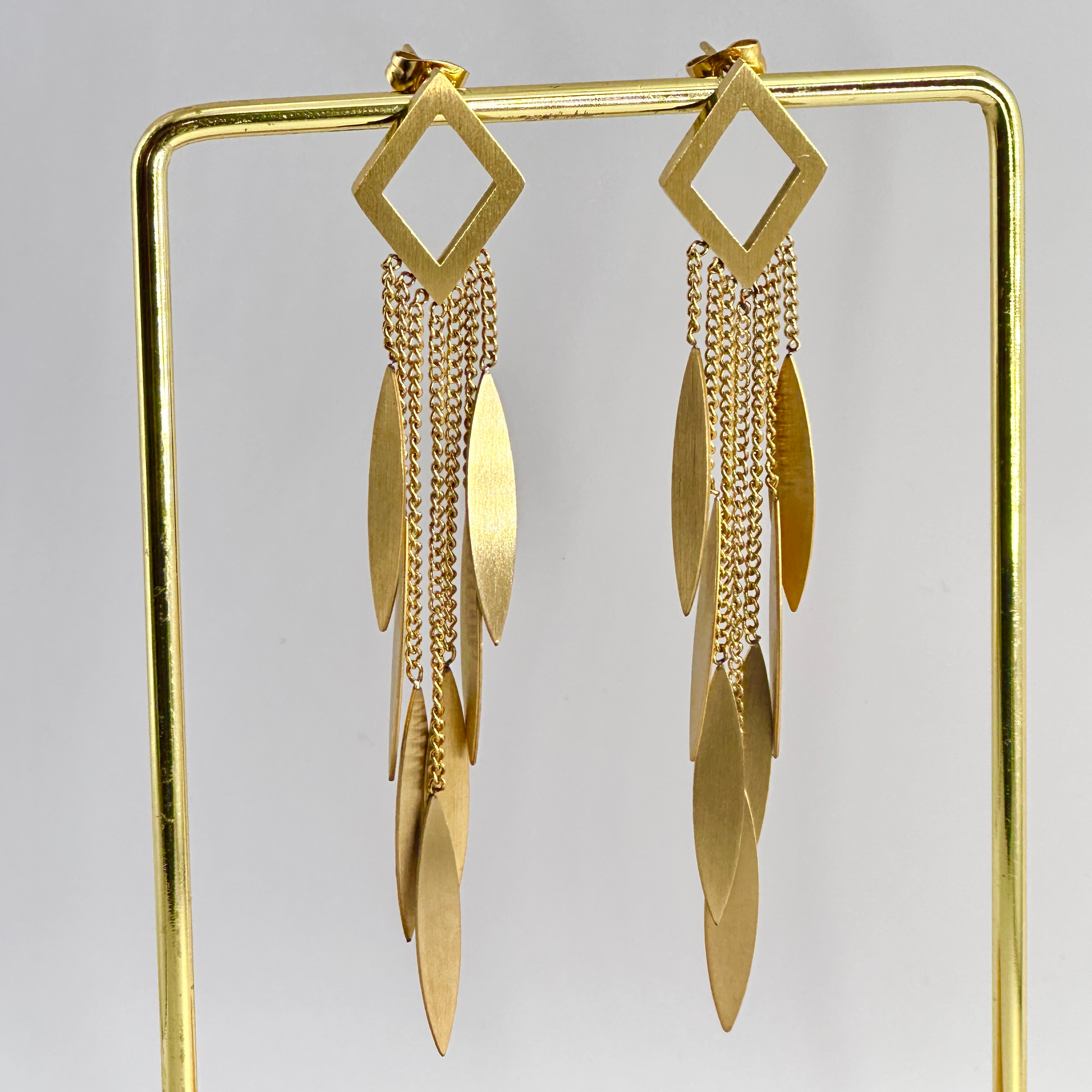 Pendientes Pocahontas en acero inoxidable que capturan la esencia de la naturaleza con elegancia. Diseño geométrico con forma de rombo del que cuelgan siete cadenas delicadas, cada una rematada con un detalle en forma de pluma. Una pieza versátil que combina simbolismo y sofisticación, perfecta para quienes buscan accesorios con carácter y significado. Resistentes y duraderos, ideales para uso diario o momentos especiales.