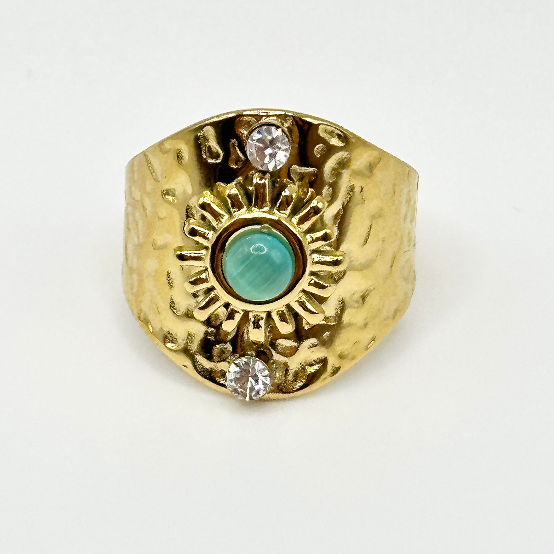 Anillo Sol Turquesa. Ajustable de acero inoxidable destaca con un sol dorado que abraza delicadamente una piedra de imitación turquesa, combinando la calidez radiante del sol con la tranquilidad del mar. Su diseño celestial aporta un toque elegante y único, ideal para quienes buscan un accesorio duradero que ilumine cualquier estilo con sofisticación y armonía. Perfecto para usar todos los días y realzar tu personalidad.